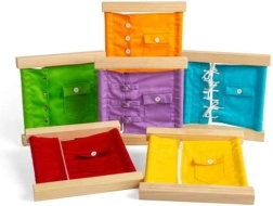 Takket være de forskellige typer lukninger tilegner børn sig sikkert praktiske færdigheder, de kan bruge hver dag. Trærammerne med tekstil er robuste, holdbare og lavet af FSC®-træ med fokus på bæredygtighed og sikkerhed.
