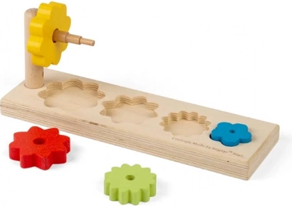 Dette træpuslespil kombinerer indpasning og stabling i én sjov aktivitet. Fire farverige blomster sorteres efter størrelse og form, hvilket naturligt understøtter udvikling af kognitive færdigheder og rumlig forståelse. Børn træner greb, præcision og tålmodighed ved korrekt placering af de enkelte brikker.