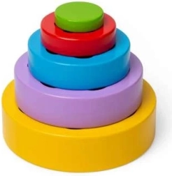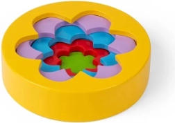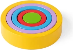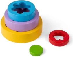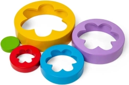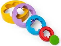 Fem dele i forskellige størrelser gør det muligt at bygge et tårn eller skabe farverige blomstermønstre. Børn lærer naturligt om farver og størrelsesforskelle.