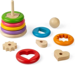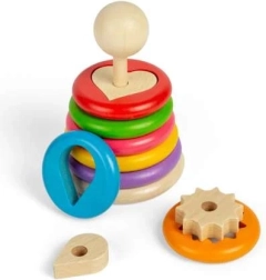 Denne originale stablingslegetøjs leveres med syv træringe, hver med en skjult form – for eksempel et hjerte, en stjerne, et blad eller et tandhjul. Børnene matcher først den rigtige form til ringen og trækker derefter hele delen på træpinden. En sjov måde at forstå former, størrelser og rumlig opfattelse på.