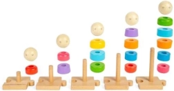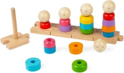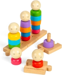 Dette træstablesæt giver børn glæden ved at udforske gennem leg. Fem separate pinde på en puslesokkel gør det muligt at bygge forskellige figurer af farvede ringe og hoveder med ansigter. Takket være de udskiftelige dele kan børn undersøge former, farver og rækkefølge og samtidig træne tålmodighed og logisk tænkning.