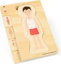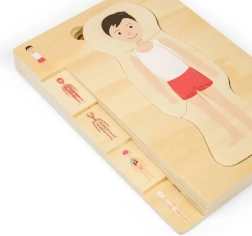 Dette læringspuslespil viser drengens anatomi i flere lag – fra skelet over muskler til organer. Børn tilegner sig interaktivt grundlæggende viden om menneskets anatomi og træner samtidig tålmodighed og rumlig forestillingsevne.
