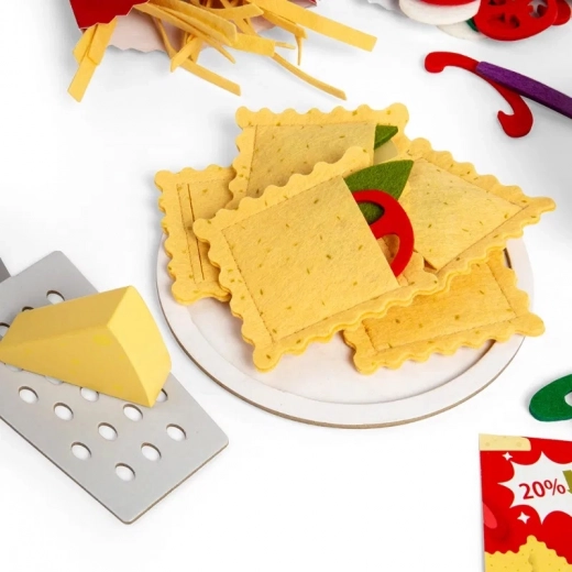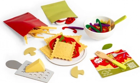 Med dette alsidige sæt kan børn lege små kokke og tilberede deres egen pastatallerken. Farverige, bløde ingredienser i filt som tagliatelle, ravioli og farfalle suppleres af tomatsauce, svampe, basilikumblade samt en træskål, tallerken, to gafler og et rivejern med et stykke parmesan – alt til realistisk køkkenleg.