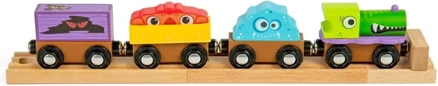 Sjovt trætog til små elskere af uhyrer – lokomotiv og tre vogne med aftagelig last, to skinner og en stopklods. Kompatibel med de fleste trætogbaner. Fremstillet af FSC-certificeret træ og behandlet med giftfri farver for sikker leg. Understøtter kreativitet, sproglige færdigheder og hånd-øje-koordination.