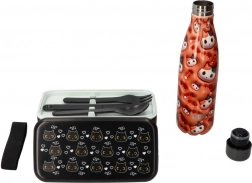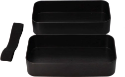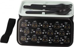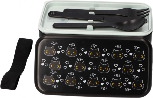 Elegant sort madkasse med kattemotiv, ideel til arbejde, skole og udflugter. To niveauer til adskilte portioner holder maden overskuelig og frisk, mens det stærke låg og det elastiske bånd sikrer sikker transport uden uønsket åbning.
