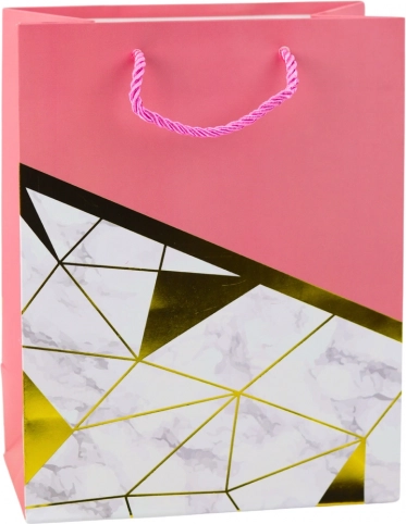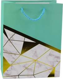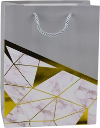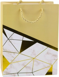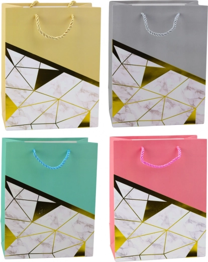 Den elegante gavepose med moderne design er det perfekte valg til enhver anledning – fra fødselsdage og jubilæer til bryllupper og sociale begivenheder. Fremstillet af kvalitets pyntkarton, og den udmærker sig ved en stilfuld kombination af geometriske mønstre med marmoreffekt og gyldne linjer. Disse metalliske gyldne linjer tilføjer et luksuriøst præg og gør posen til en elegant gaveindpakning.