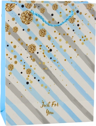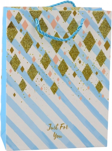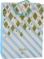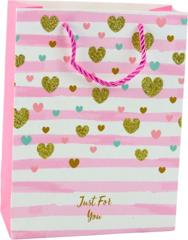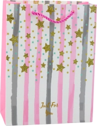 Gaveposerne er udstyret med komfortable snorehåndtag i lyserød og blå, hvilket gør dem lette at bære. Hver pose er dekoreret med glitrende motiver såsom stjerner, hjerter, romber og gyldne prikker, der tilfører elegance og flair.