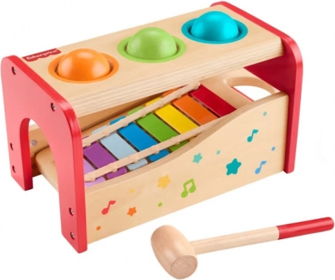 Fisher-Price multifunktionelt trælegetøj tilbyder to legetøj i ét: en bænk til at spille på xylofonen og en aftagelig xylofon til selvstændig spil. Børn kan slå eller skubbe kugler, så de rammer xylofonens tangenter, eller tage xylofonen ud for at spille separat.