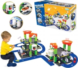 Nyd timevis af sjov med denne flotte treetagers mega-garage, som omfatter moderne to- og treetagers parkeringspladser. Børn kan ved hjælp af elevatoren flytte bilerne mellem etagerne og parkere dem, som de vil.