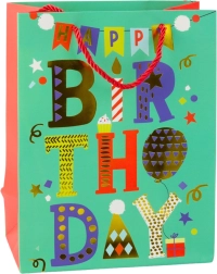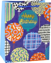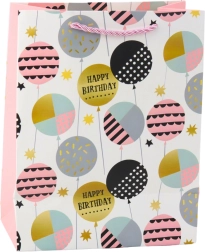Stilfuld fødselsdags-gavepose af solidt dekorationskarton i et moderne, muntert design. Skiller sig ud med livlige farver, teksterne Happy Birthday og ballonmotiver. Takket være det holdbare materiale og de snorede håndtag bærer den sikkert selv tungere gaver. Den universelle størrelse på 23 × 18 × 10,5 cm passer til både mindre og mellemstore overraskelser.