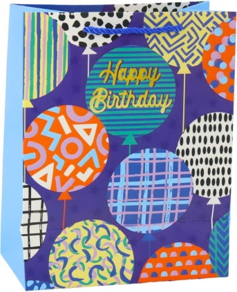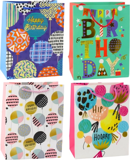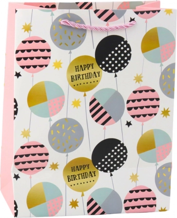 Forskellige motiver med balloner, stjerner og teksten “Happy Birthday” giver gaven en festlig stemning og fanger opmærksomheden.