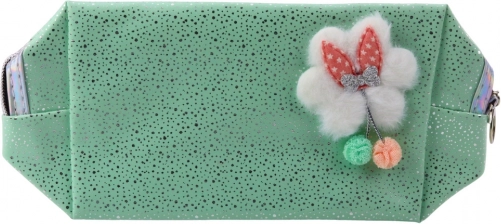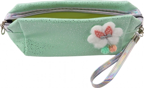 Penalhus/kosmetikpung med sløjfe, glitrende partikler og sky-motiv, mint