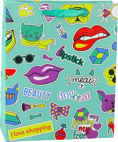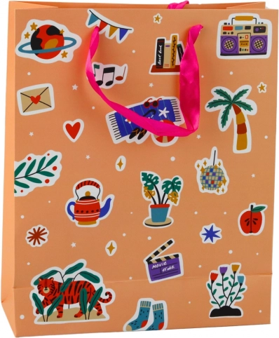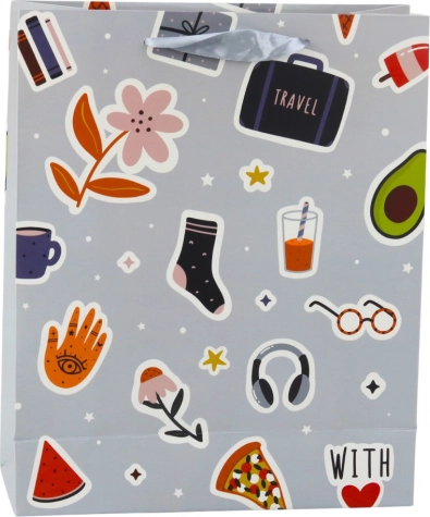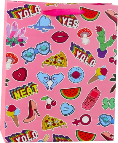 En original gavepose med print af farvede klistermærker og moderigtige tekster fanger opmærksomheden ved første øjekast. De levende farver og det trendy design gør den til et perfekt supplement til gaver til både unge og voksne. Med målene 32 × 26 × 12 cm rummer den komfortabelt både mindre og mellemstore gaver.