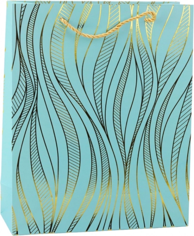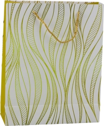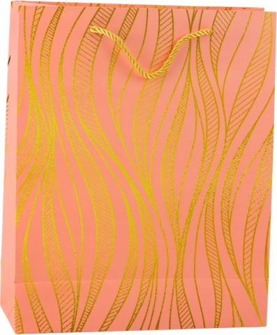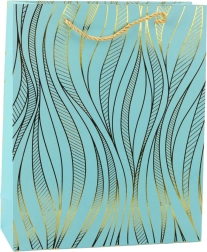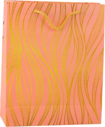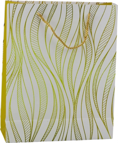 Denne stilfulde gavepose udmærker sig ved et elegant gyldent bølgemotiv på farvet baggrund og en solid konstruktion, der pålideligt bærer også tungere overraskelser. Matchende snorehåndtag giver komfortabel og sikker transport.