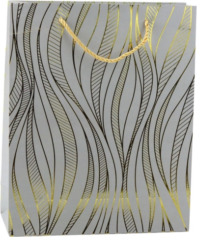 Elegant gavepose med moderne design og et eksklusivt gyldent bølgemønster, ideel til fødselsdage, bryllupper og jubilæer. Den er lavet af kvalitetspræget karton, har stærke snorehåndtag og rummer takket være målene 32 × 26 × 12 cm bekvemt både mellemstore og større gaver.