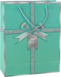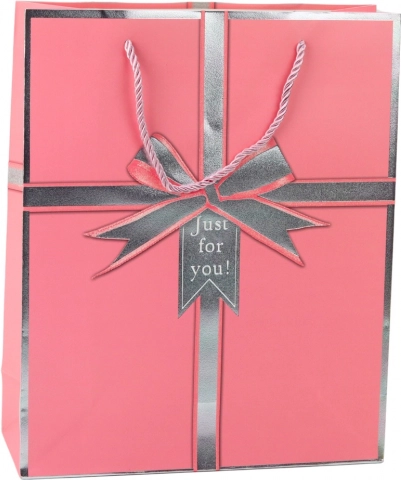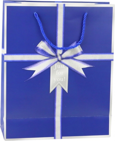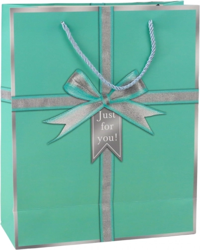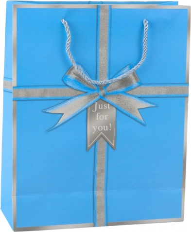 Elegant gavepose med motiv af en sølvfarvet sløjfe og teksten "Just for you!", som giver enhver gave et stilfuldt udtryk. Den er lavet af kvalitetspræget karton, har stærke snorehanke og en universel størrelse på 32 × 26 × 12 cm til både mindre og mellemstore gaver. Fås i 4 elegante farver – blå, grøn, lyserød og lyseblå.