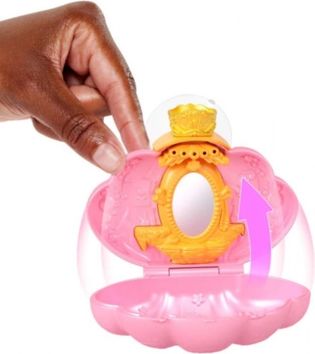 Den åbnelige muslingeskal gemmer på en scene med et lille spejl og detaljer til fantasifuld leg. Let at tage med og hurtigt at rydde op.