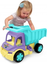 Oplev den superholdbare dumptruck WADER Gigant i en attraktiv lilla‑turkis kombination. Takket være længden på 55 cm, en åbnbar ladkasse med komfortabelt håndtag og trækøjer for og bag kan den transportere legetøj, sand og små skatte. Den solide konstruktion med bæreevne op til 150 kg sikrer stabilitet selv ved mere krævende børneleg.