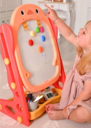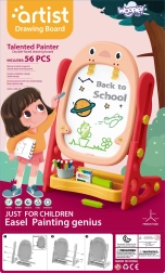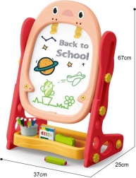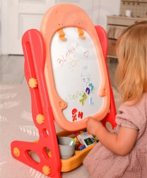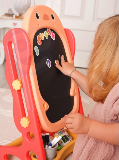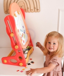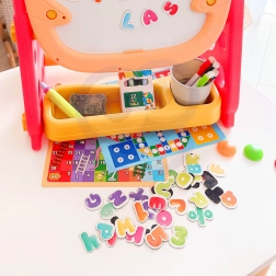 Alt hvad børn behøver er inkluderet: magnetisk alfabet og tal, tuscher, kridt, svamp, en praktisk hylde og kop til redskaber samt to brætspil til fælles sjov. De kompakte mål gør den nem at placere på børneværelset.