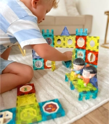 Sættet indeholder forskellige former til at bygge tårne, huse og slotte, 2 figurer til rolleleg, klistermærker til at tilføje detaljer og en vejledning med inspiration. Den praktiske æske med hank er let at tage med og er en fantastisk gave.
