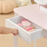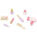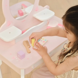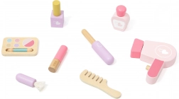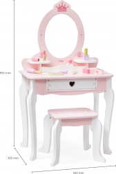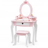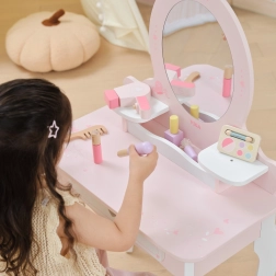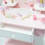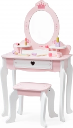 Den praktiske skuffe og sidehylder gemmer alle skatte. Sættet indeholder et rigt udvalg af trætilbehør: palette med pensel, læbestift, neglelakker, parfume, kam, blød pudrebørste og hårtørrer. Legetøjet har glatte kanter og en overflade behandlet med ugiftige farver for sikker leg.