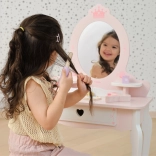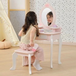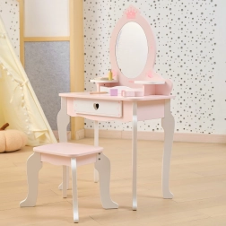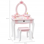 Dette pink‑hvide toiletbord i kvalitets træ giver børn et sikkert sted til fantasifuld sminkning og frisering. Det ovale spejl med krone-motiv, søde hjerte-detaljer og den stabile skammel skaber en eventyrlig atmosfære på værelset.