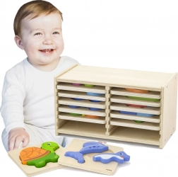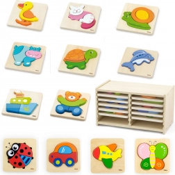 Barnets opgave er at placere de farvede puslespilsbrikker korrekt på det tilhørende bræt. Enkle former, smukke billeder og tiltalende farver fanger børns opmærksomhed og hjælper dem med at udvikle deres puslefærdigheder. Sættet indeholder også en træholder til opbevaring af brætterne.