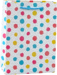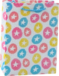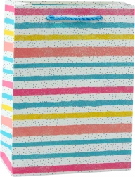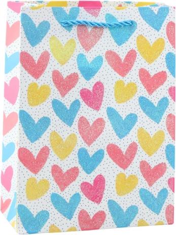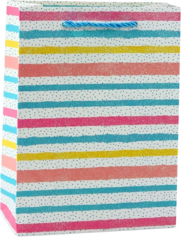 Denne gavepose er fremstillet af holdbart dekorativt karton, som sikrer dens robusthed og æstetiske udtryk. Motiverne med farvede hjerter, stjerner, prikker og striber giver posen et let og sjovt præg, der passer perfekt til forskellige typer gaver. De stærke snorehanke i matchende farver gør den behagelig at bære.
