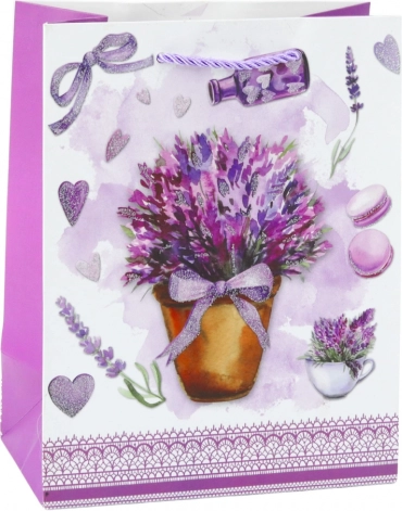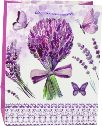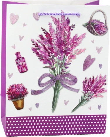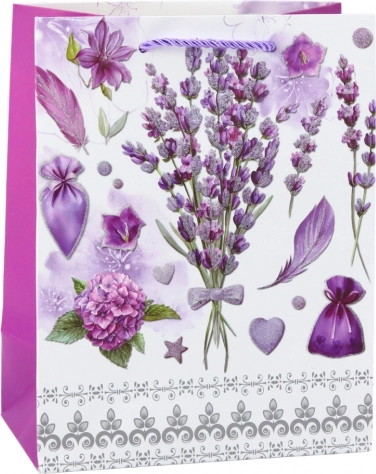 Posen er lavet af dekorativt karton i høj kvalitet, hvilket sikrer dens holdbarhed og æstetiske udseende, selv ved hyppig brug. Lavendelmotivet i kombination med glitrende accenter og lilla detaljer tilfører helheden charme og elegance. De robuste lilla snorehanke giver behagelig bæring, og den solide konstruktion gør det muligt sikkert at pakke mindre og mellemstore gaver.