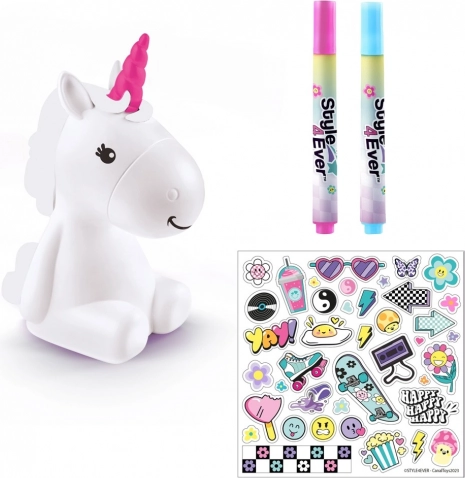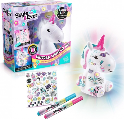 Bring magi ind på børneværelset med det kreative sæt Style4Ever lysende enhjørning, som børnene kan dekorere selv. Når den er færdig, lyser enhjørningen med 8 farver og skaber en hyggelig atmosfære. I pakken finder du en lysende figur, 4 tuscher, klistermærker og en nem vejledning, og batterier er inkluderet. Velegnet fra 6 år.