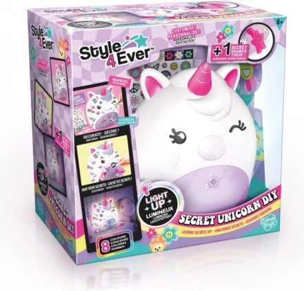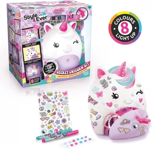 DIY enhjørningelampe fra Style4Ever med hemmeligt rum. Lyser i 8 farver, inkluderer tuscher, klistermærker og rhinsten. Kreativ sjov for børn fra 6 år.