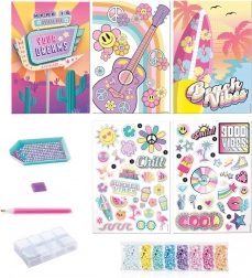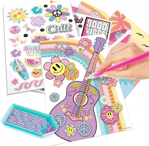 2 ark klistermærker, mere end 2500 stk. farvede sten, applikator/pen, bakke, voks, organizer til sten