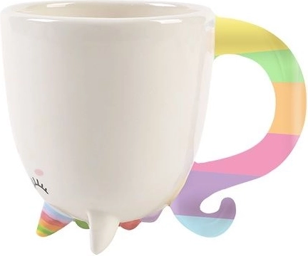 Hvid keramik med et regnbuefarvet hank/hale og et sødt ansigt virker både nuttet og originalt. Ideel som dekoration og som dagligt krus.