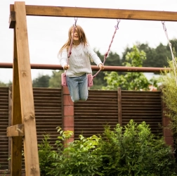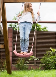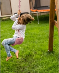 Stilfuld og sikker gynge til børn, ideel til haven eller hjemmet. Den er designet til at give stabilitet og komfort takket være det profilerede sæde og de solide reb.