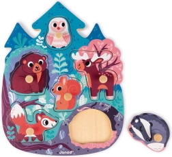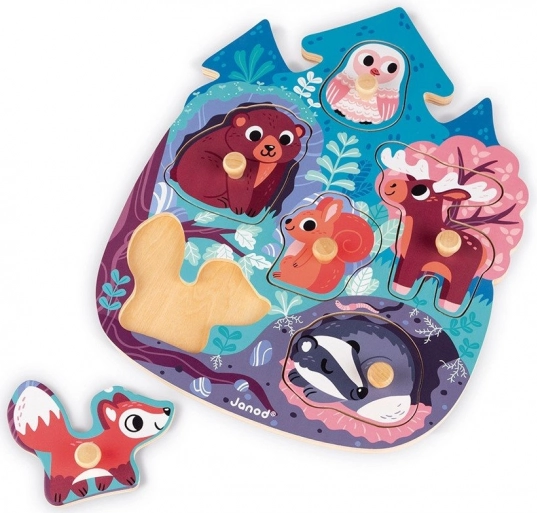 Opdag et legende træpuslespil med seks skovdyr, som udvikler børns finmotorik, opmærksomhed og hukommelse. Takket være trægreb kan brikkerne nemt sættes i, og den solide base med rammer hjælper dyrene med at blive på deres plads. Perfekt til at lære at kende ugle, bjørn, hjort, egern, ræv og grævling. Velegnet fra 12 måneder.