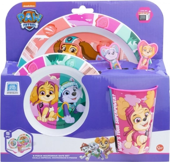 Et sødt og praktisk børnespisessæt 5-i-1 med PAW PATROL-motiv gør hvert måltid hyggeligere takket være det farverige print. Indeholder tallerken, skål, ske, gaffel og kop. Sættet er BPA-frit, og koppen er egnet til mikroovn (600 W / 2 min).
