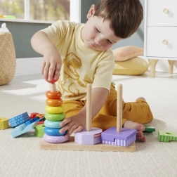 Tre forskellige sæt dele – ringe, ottekantede klodser og todelte rektangler – understøtter trinvis læring i sortering og stabling.