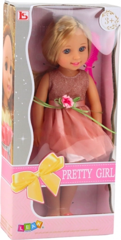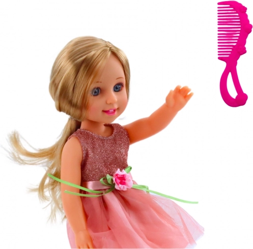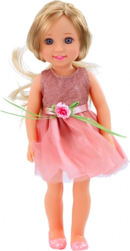 Dukken er klædt i en smuk, glitrende kjole med tylskørt, pyntet med en fin blomst og en grøn sløjfe, som understreger hendes feminine udtryk. Det samlede look fuldendes af lyserøde sko, perfekt matchet med kjolen. Bevægelige arme og ben sikrer, at dukken ikke kun er visuelt attraktiv, men også meget funktionel under leg – hun kan let poseres, sættes ned eller “danse” i fantasifulde scener.