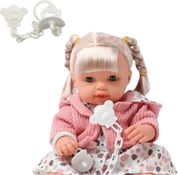 Andre træk er de realistiske lydeffekter – dukken udleder lyde som latter eller gråd, hvilket bringer legen til live og gør den mere rig. Dukken har farverige kjoler og en blød lyserød sweater, der kan tages af, hvilket tilføjer flere muligheder for kreativ leg. Sættet inkluderer også en sut med kæde og vedhæng, hvilket får barnet til at føle sig som en rigtig plejer. Den er lavet af holdbar og sikker plastik, er let, behagelig at røre ved og ideel til daglig omfavnelse, pleje og fælles sjov.