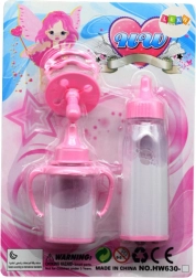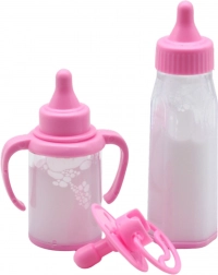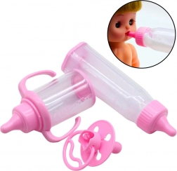 Indeholder to forskellige flasker og en sut i en blød lyserød farve. Perfekt til rollespil og simulering af dukkepleje.