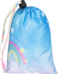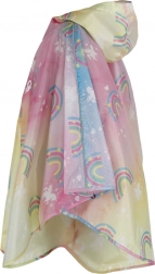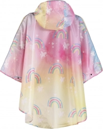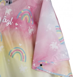 Stilfuld børneponcho til regn med hætte og skygge i et magisk design med enhjørninger og regnbuer. Let, vandtæt materiale, reflekterende elementer for sikkerhed og snit til at bæres over rygsæk eller skoletaske gør regnponchoen til det ideelle valg til skole og udflugter. Der medfølger en praktisk snørepose i matchende design.