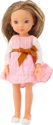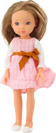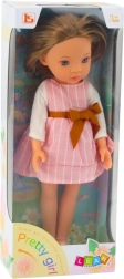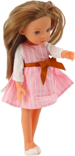 Dukken Pretty Girl er et højdepunkt for enhver lille pige takket være hendes smukt formede ansigt med et blidt smil og store øjne. Hun har blødt, behageligt hår, der kan redes og styles. Hun er klædt i en lyserød kjole med hvide striber, suppleret med hvide ærmer og en pyntet brun sløjfe i taljen. Denne elegante kombination fuldendes af klassiske hvide sko. Tøjet kan tages af, hvilket muliggør udklædningsleg og skabelse af egne modekreationer.