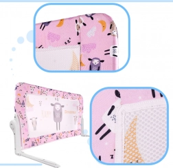 Installationen er hurtig og uden boring – fødderne skubbes blot ind under madrassen. Det sarte lyserøde design med fåremotiv passer til de fleste interiører og gør børneværelset hyggeligt. Kanten er ideel til overgangen fra tremmeseng til stor seng og hjælper både forældre og børn med at sove roligere og mere sikkert.