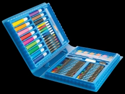 Dette alsidige sæt vil glæde enhver lille kunstner. I den robuste plastboks finder du vandfarver, tuscher, voksfarver og farveblyanter, suppleret med blyantspidser og viskelæder. Takket være den overskuelige indretning har hver del sin plads, og sættet er let at bære.