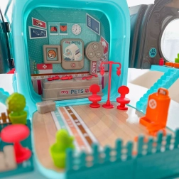 Sættet indeholder en lægefigur, hundekammerater, møbler og klinikudstyr samt lægeinstrumenter (stetoskop, sprøjte m.m.), desuden kam, saks og andet tilbehør til pleje. Hele løsningen er let, kompakt og nem at bære – perfekt til rejser og børneværelset.