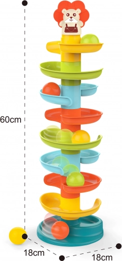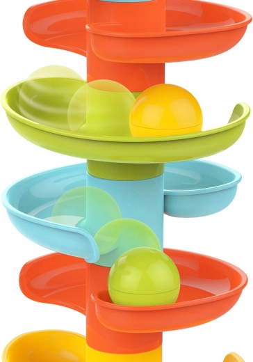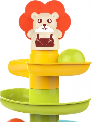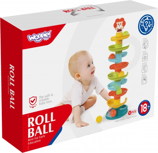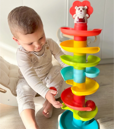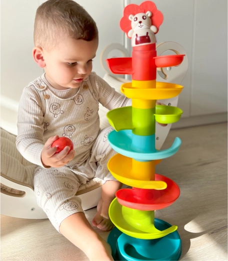 Byg det farverige spiraltårn og se kuglerne rulle ned gennem niveauerne. Delene i kuglebanen klikkes nemt sammen, så børn kan bygge igen og igen og samtidig træne tålmodighed og kreativitet. Hver af de 6 farvede kugler rasler behageligt under bevægelse, hvilket stimulerer sanserne og forlænger legetiden.