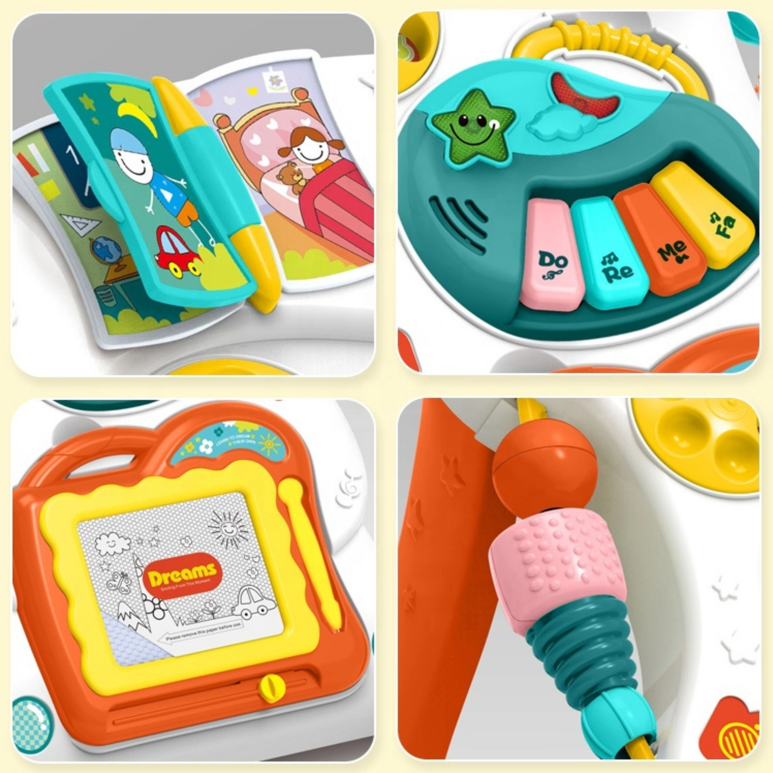 Inkluderer en magnettavle (magnetisk tegnetavle) til endeløs tegning uden rod, et lille klaver med melodier, et sikkert spejl, en farverig bog og en aftagelig telefon, der også fungerer som selvstændigt legetøj. Kurv og 3 bolde indbyder til yderligere lege og træning af koordination.