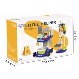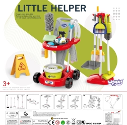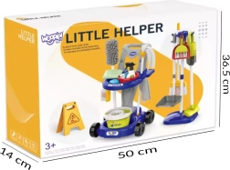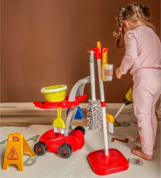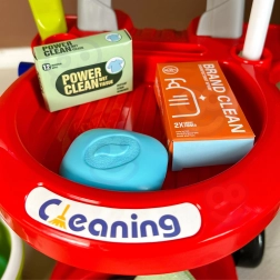 Alt nødvendigt er inkluderet: vogn på hjul, moppe, kost og børste med fejebakke, spand, sprayflaske, klude, advarselsskilt “Pas på, glat gulv” og andet tilbehør. Mængden af dele giver børn timevis af sjov og understøtter rolleleg samt samarbejde med søskende.