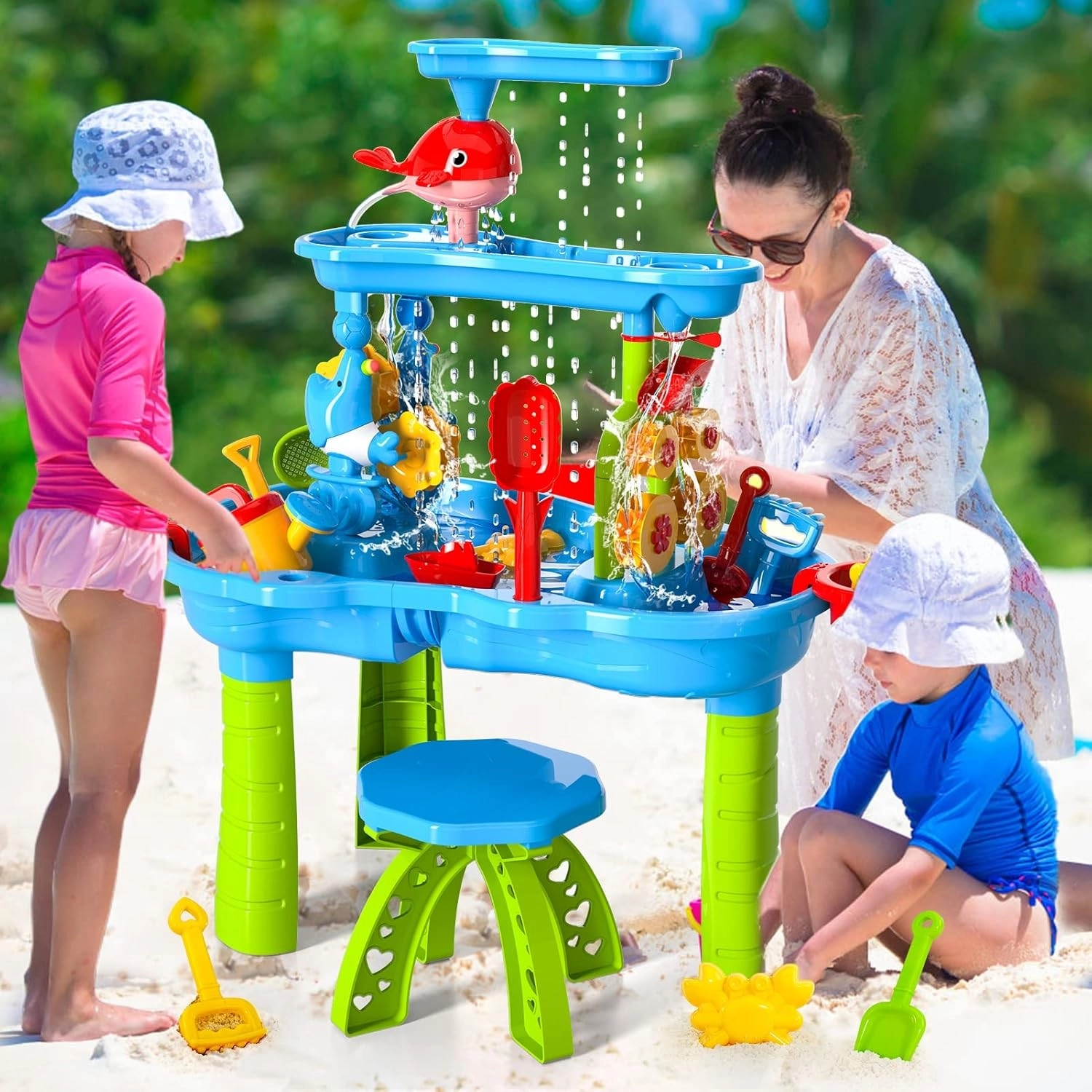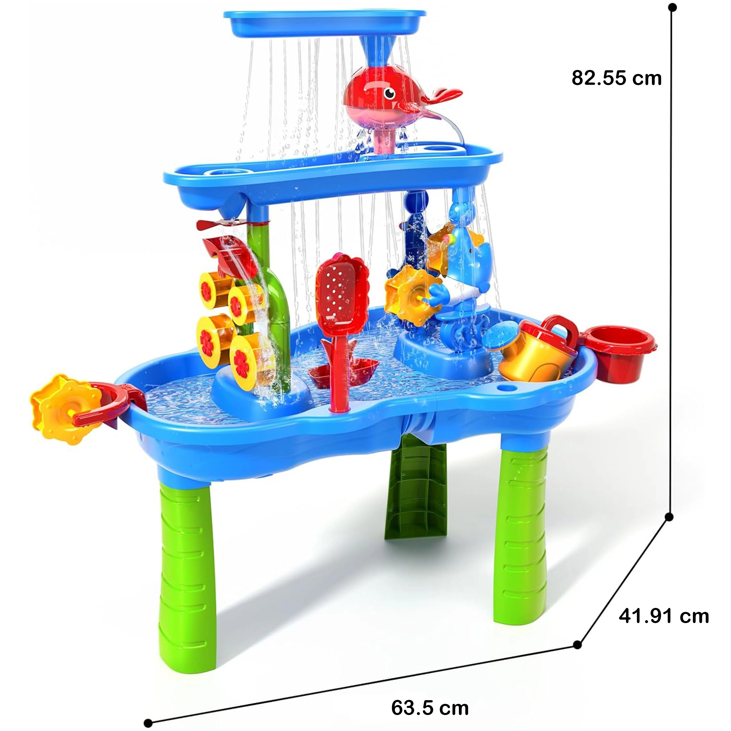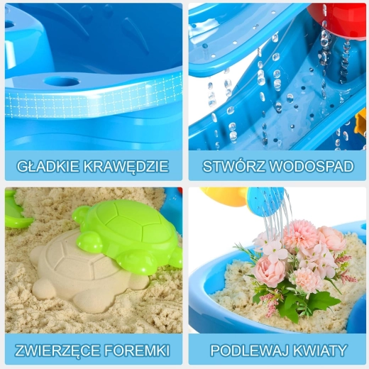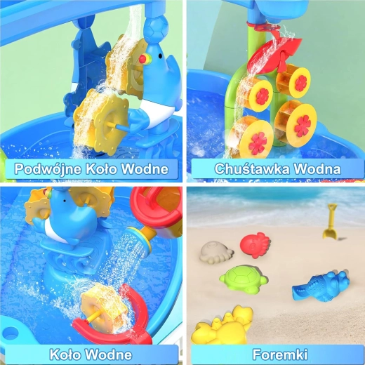 WOOPIE vand- og sandbord XL giver børn året rundt sjov – kølende vandaktiviteter om sommeren og kreative lege med sand eller kinetisk sand i de køligere perioder. Takket være det 3-etagers kaskadesystem hælder børn vand i den øverste beholder og ser, hvordan strømmen sætter vandhjul og møller i gang og løber ned i de nederste kar. Sættet inkluderer også en skammel og et bredt udvalg af redskaber til leg og eksperimenter.
