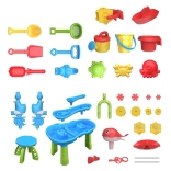 Pakkens indhold: 2× spand, 1× vandkande, 5× form, 1× simpel mølle, 5× sandredskaber (f.eks. skovl, rive, si), vand-/sandbord med monteringsdele, 1× stol.